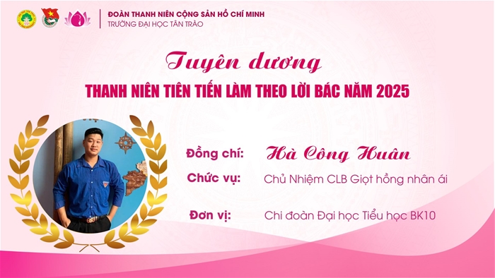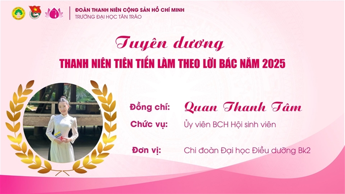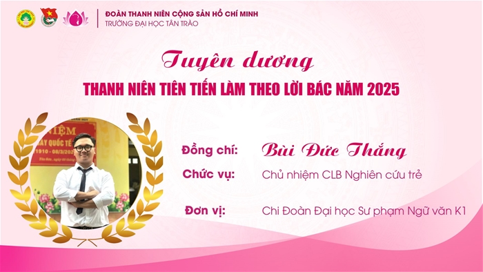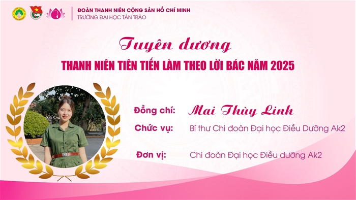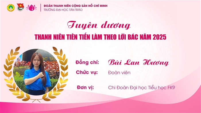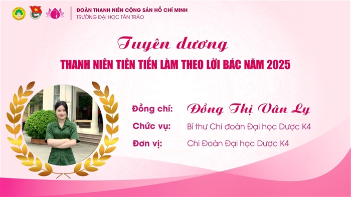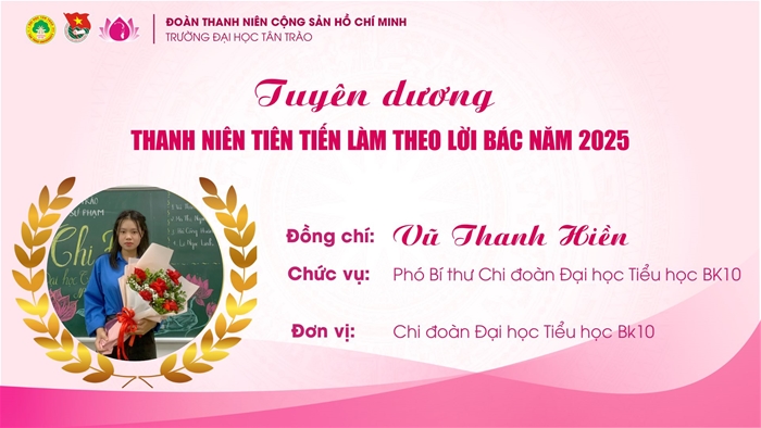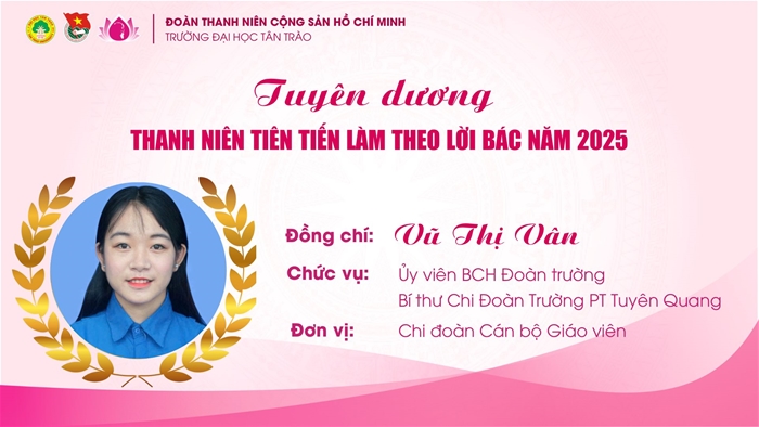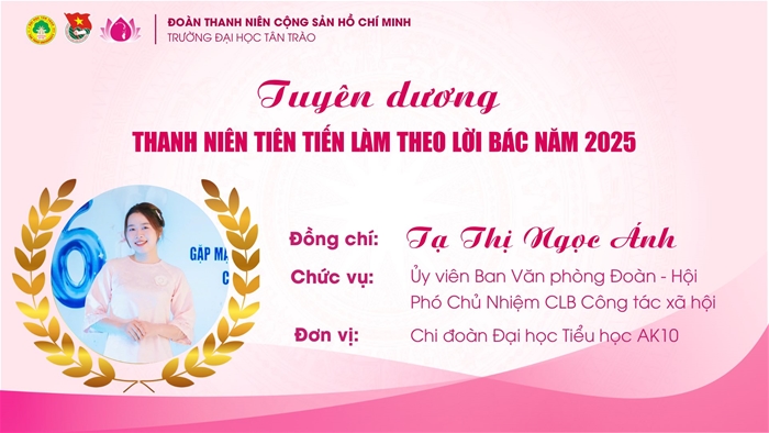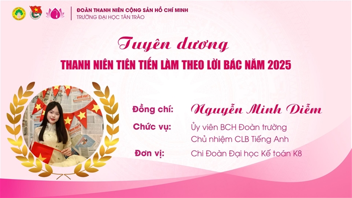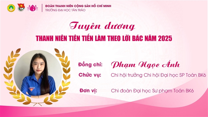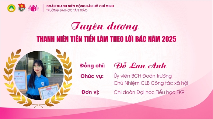 Danh hiệu “Thanh niên tiên tiến làm theo lời Bác” là danh hiệu cao quý dành cho những đoàn viên, thanh niên ưu tú có lối sống đẹp, lý tưởng cao cả và khát vọng cống hiến cho cộng đồng. Đây không chỉ là sự ghi nhận xứng đáng với nỗ lực của mỗi cá nhân, mà còn là động lực để lan tỏa tinh thần sống có lý tưởng, có trách nhiệm, sẵn sàng dấn thân, hành động vì Tổ quốc.
