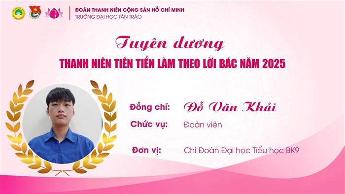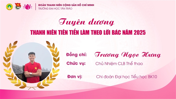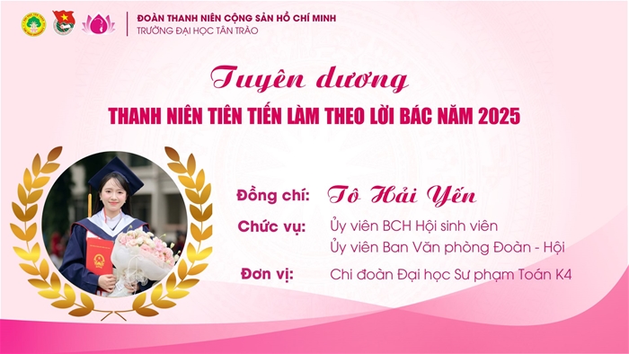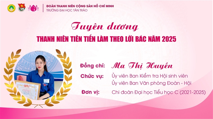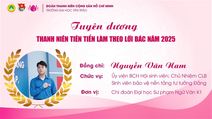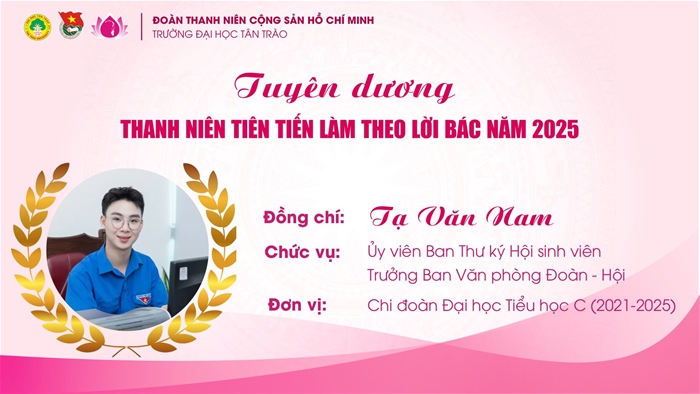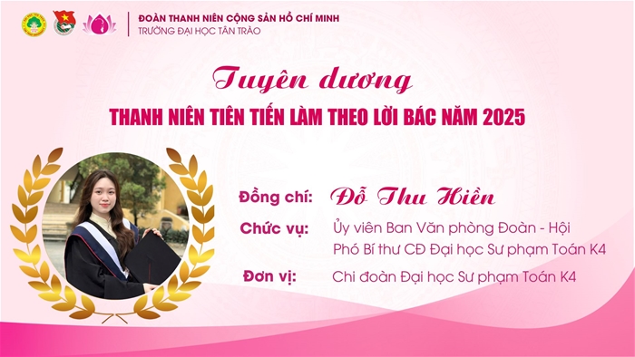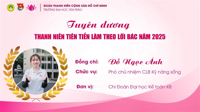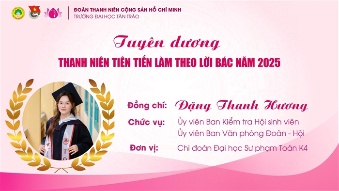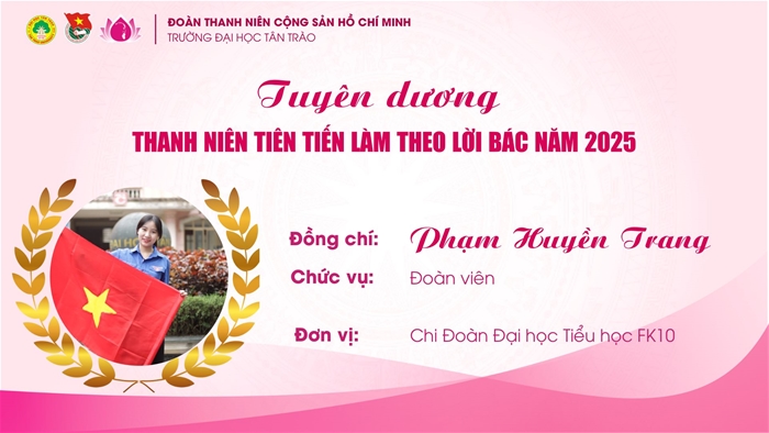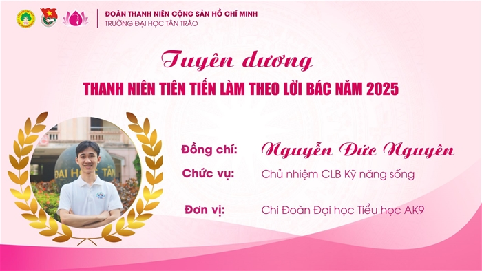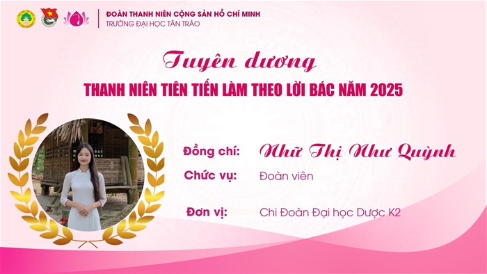 Danh hiệu “Thanh niên tiên tiến làm theo lời Bác” là danh hiệu cao quý dành cho những đoàn viên, thanh niên ưu tú có lối sống đẹp, lý tưởng cao cả và khát vọng cống hiến cho cộng đồng. Đây không chỉ là sự ghi nhận xứng đáng với nỗ lực của mỗi cá nhân, mà còn là động lực để lan tỏa tinh thần sống có lý tưởng, có trách nhiệm, sẵn sàng dấn thân, hành động vì Tổ quốc.