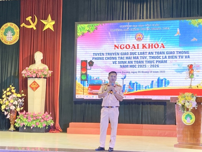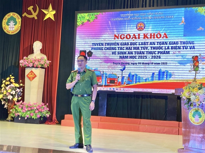 Tham dự buổi tuyên truyền có TS. Lê Thiếu Tráng, ThS. Nguyễn Thúy Nga – Phó Hiệu trưởng nhà trường; đại diện Phòng Cảnh sát Giao thông, Công an tỉnh Tuyên Quang, Công an phường Minh Xuân cùng toàn thể cán bộ, giáo viên và học sinh của trường.