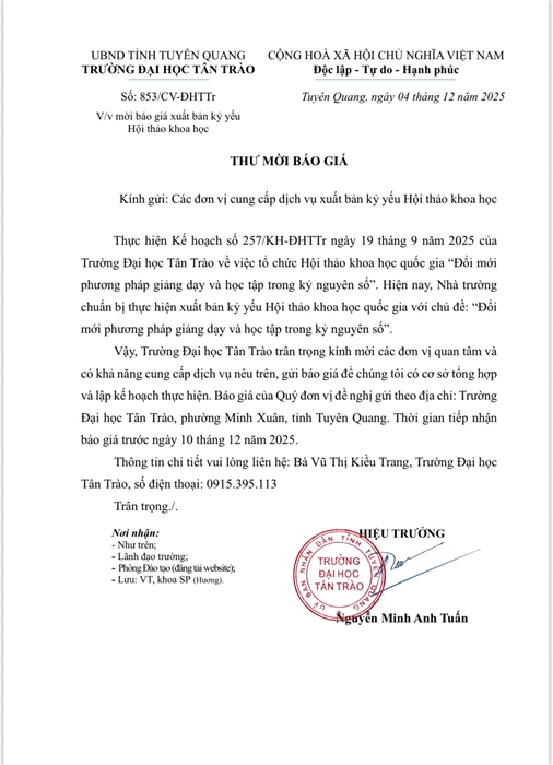 • THÔNG BÁO Về việc mời viết bài đăng Tạp chí khoa học Trường Đại học Tân Trào (20-10-2025)
