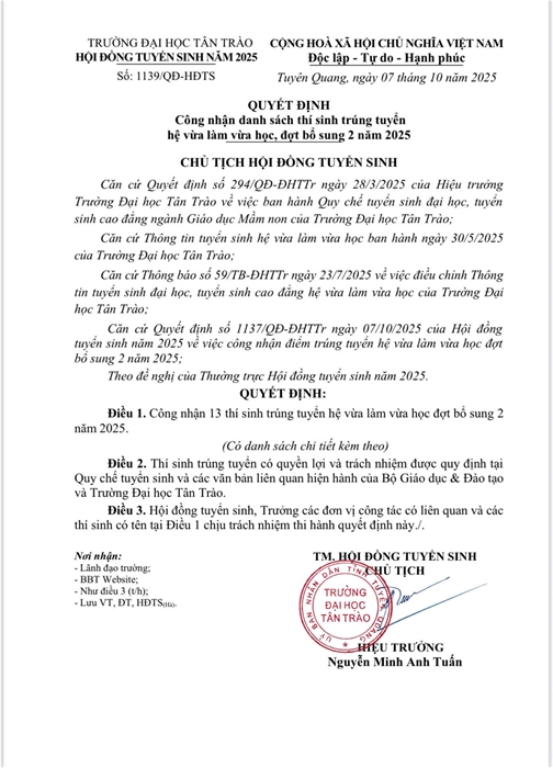 QUYẾT ĐỊNH Công nhận danh sách thí sinh trúng tuyển hệ vừa làm vừa học, đợt bổ sung 2 năm 2025