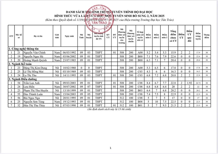 Danh sách thí sinh trúng tuyển trình độ đại học, hệ chính qui đợt tuyển sinh bổ sung 1, năm 2025