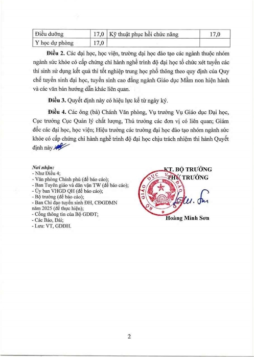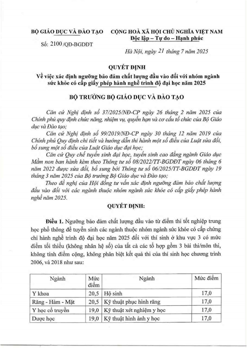 Quyết định Về việc xác định ngưỡng bảo đảm chất lượng đầu vào đối với nhóm ngành sức khoẻ có cấp giấy phép hành nghề trình độ đại học năm 2025