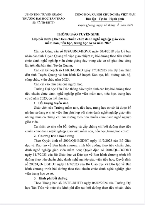 Thông báo tuyển sinh Lớp bồi dưỡng theo tiêu chuẩn chức danh nghề nghiệp giáo viên mầm non, tiểu học, trung học cơ sở năm 2025