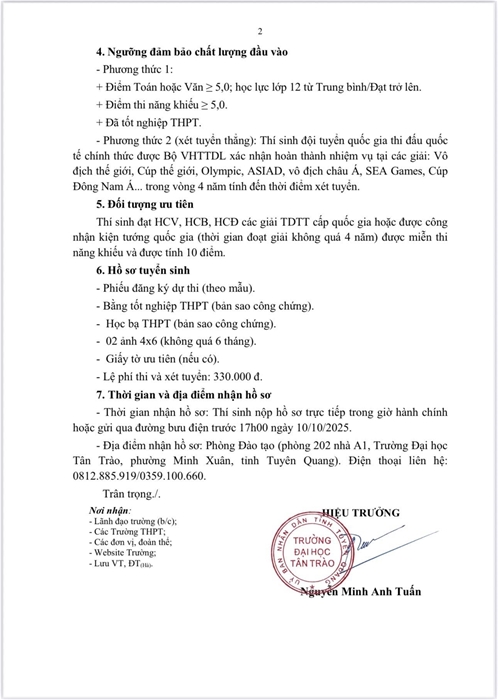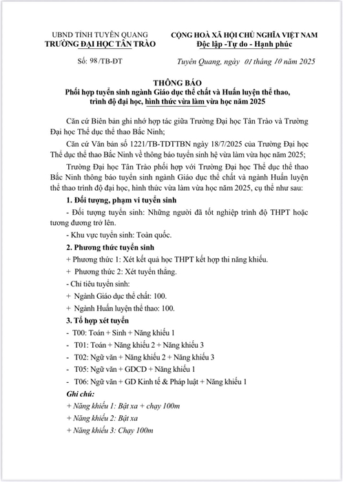 Trường Đại học Tân Trào thông báo gia hạn thời gian nhận hồ sơ tuyển sinh Ngành: Giáo dục Thể chất và Huấn luyện Thể thao Trình độ Đại học, Hình thức vừa làm vừa học năm 2025