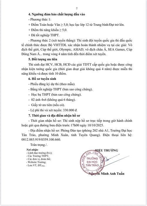 Trường Đại học Tân Trào thông báo gia hạn thời gian nhận hồ sơ tuyển sinh Ngành: Giáo dục Thể chất và Huấn luyện Thể thao Trình độ Đại học, Hình thức vừa làm vừa học năm 2025