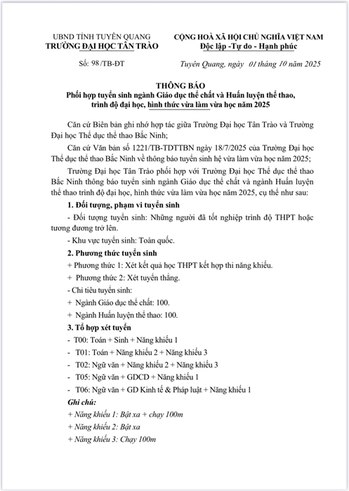 Nhằm tạo điều kiện thuận lợi cho thí sinh có nguyện vọng theo học các ngành thuộc khối Thể dục thể thao, Trường Đại học Tân Trào thông báo gia hạn thời gian nhận hồ sơ tuyển sinh đến hết ngày 30/10/2025.
