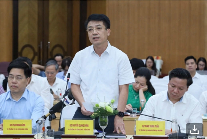 Ông Nguyễn Quang Dũng, Vụ trưởng Vụ Công chức - Viên chức (Bộ Nội vụ) giải đáp, làm rõ các vấn đề tại Hội nghị - Ảnh: VGP/TG