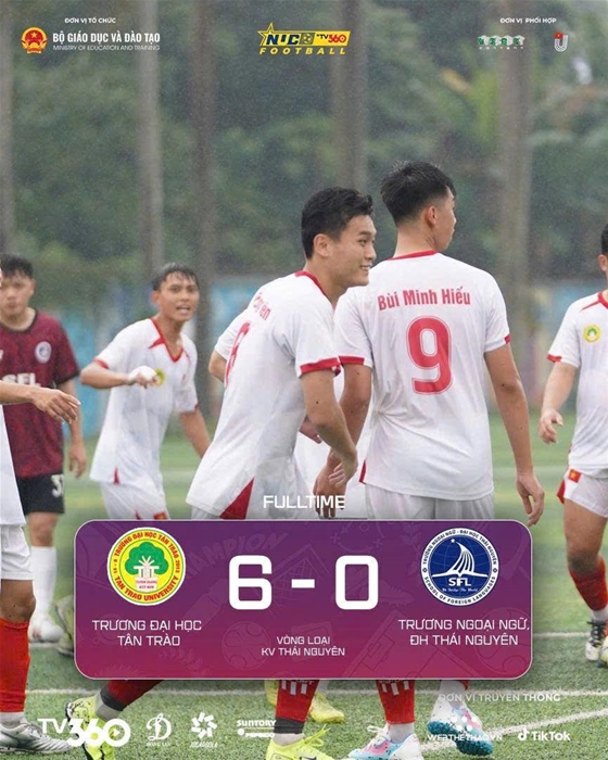 Trong trận ra quân tại Vòng loại khu vực Thái Nguyên – Giải Bóng đá Nam Sinh viên Toàn quốc Cúp TV360 năm 2025, đội tuyển bóng đá nam sinh viên Trường Đại học Tân Trào đã có màn trình diễn đầy ấn tượng, thể hiện phong độ vượt trội và tinh thần thi đấu quyết tâm. Với lối chơi gắn kết, kỹ thuật và hiệu quả, các cầu thủ đội tuyển bóng đá nam sinh viên TQU đã giành chiến thắng thuyết phục 6 – 0 trước đội tuyển Trường Ngoại ngữ – Đại học Thái Nguyên, qua đó khẳng định sức mạnh và khởi đầu đầy thuận lợi tại giải đấu năm nay.