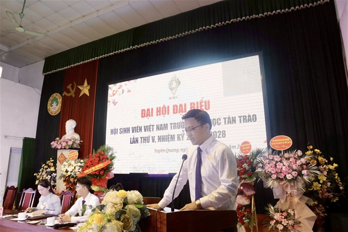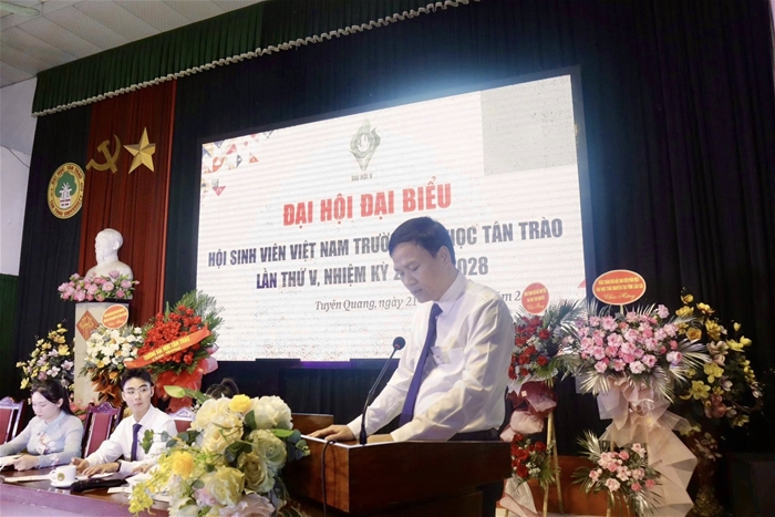 Phát biểu tại Đại hội, TS. Phạm Duy Hưng – Bí thư Đảng ủy, Phó Hiệu trưởng Trường Đại học Tân Trào biểu dương và ghi nhận những kết quả đáng khích lệ mà Hội Sinh viên và các bạn sinh viên nhà trường đã đạt được trong nhiệm kỳ vừa qua. Tiến sĩ nhấn mạnh, Hội Sinh viên Trường Đại học Tân Trào đã thể hiện rõ vai trò là tổ chức đại diện, đồng hành cùng sinh viên trong học tập, nghiên cứu, khởi nghiệp, sáng tạo và hội nhập quốc tế. Tiến sĩ đề nghị Ban Chấp hành Hội Sinh viên khóa mới tiếp tục kế thừa, phát huy truyền thống đoàn kết, năng động, sáng tạo; xây dựng tập thể Ban Chấp hành thật sự là hạt nhân đoàn kết, gương mẫu trong học tập, rèn luyện và đạo đức lối sống. Mỗi phong trào, hoạt động của Hội cần có chiều sâu, lan tỏa và phù hợp với nhu cầu, nguyện vọng của sinh viên trong bối cảnh chuyển đổi số và hội nhập quốc tế, gắn với các tiêu chí “Sinh viên 5 tốt” và mục tiêu phát triển bền vững của Nhà trường.