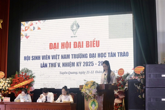 Kết thúc Đại hội, đồng chí Ngô Thanh Huyền – Chủ tịch Hội Sinh viên Việt Nam Trường Đại học Tân Trào khóa V, nhiệm kỳ 2025 – 2028 thay mặt Ban Chấp hành khóa mới bày tỏ lòng cảm ơn sâu sắc tới Ban Thường vụ Tỉnh Đoàn Tuyên Quang, Ban Thư ký Trung ương Hội Sinh viên Việt Nam, Đảng ủy – Ban Giám hiệu Nhà trường, các phòng, ban, khoa, tổ chức đoàn thể đã luôn quan tâm, chỉ đạo và tạo điều kiện thuận lợi để công tác Hội và phong trào sinh viên Trường Đại học Tân Trào không ngừng phát triển. Chủ tịch Hội Sinh viên khóa mới khẳng định: “Ban Chấp hành Hội Sinh viên Việt Nam Trường Đại học Tân Trào khóa V, nhiệm kỳ 2025 – 2028 sẽ phát huy tinh thần đoàn kết, bản lĩnh, trí tuệ và sáng tạo, quyết tâm thực hiện thắng lợi Nghị quyết Đại hội, xây dựng Hội Sinh viên Trường ngày càng vững mạnh, góp phần vào sự phát triển chung của Trường Đại học Tân Trào và phong trào sinh viên cả nước.”