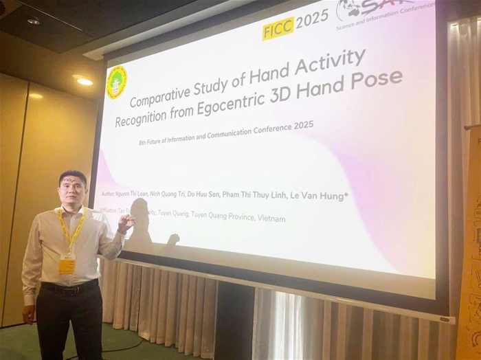 Căn cứ vào thư mới của ban tổ chức hội thảo “Tương lai của Công nghệ thông tin và truyền thông” (FICC2025 - https://saiconference.com/FICC) về việc trình bày Miệng công bố “Nghiên cứu về nhận dạng cử chỉ bàn tay từ tư thế bàn tay 3D của cảm biến đeo”, ngày 28-29 tháng 4 năm 2025; Căn cứ Quyết định số 01/QĐ-HĐQL-NAFOSTED ngày 5/02/2025 của Quỹ phát triển khoa học công nghệ Quốc gia, Bộ Khoa học Công nghệ về việc hỗ trợ kinh phí cho hoạt động nâng cao năng lực nghiên cứu khoa học; Căn cứ Kế hoạch 52/KH-ĐHTTr ngày 20 tháng 2 năm 2025 về việc Thành lập đoàn công tác tham dự hội thảo khoa học quốc tế tại Cộng hoà Liên Bang Đức và thăm, làm việc tại Đại học Ghent, Vương Quốc Bỉ, Đoàn công tác Trường Đại học Tân Trào gồm PGS. TS. Lê Văn Hùng và sinh viên Đỗ Hữu Sơn, CNTT K2 (2021-2025) đã tới tham dự và trình bày Miệng thành công và trao đổi học thuật với các Giáo sư, chuyên gia hàng đầu thế giới về Công nghệ thông và truyền thông tại Hội thảo FICC2025.