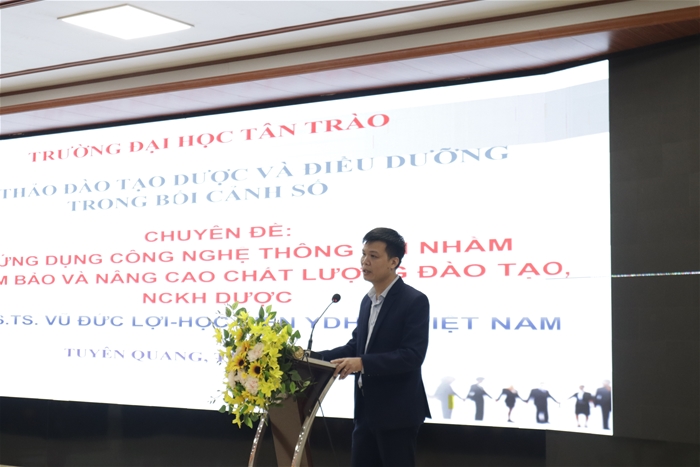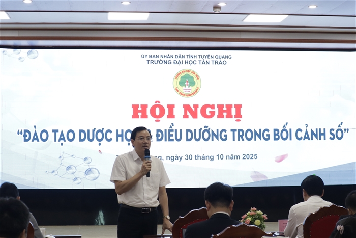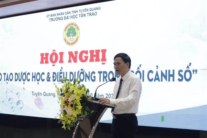 Phát biểu khai mạc Hội nghị, TS. Phạm Duy Hưng - Phó Hiệu trưởng Trường Đại học Tân Trào nhấn mạnh tầm quan trọng và ý nghĩa của việc đổi mới đào tạo các ngành Dược học và Điều dưỡng trong bối cảnh chuyển đổi số. Tiến sĩ khẳng định, chuyển đổi số không chỉ là xu thế tất yếu mà còn là cơ hội để các cơ sở đào tạo Y - Dược nâng cao chất lượng giảng dạy, nghiên cứu và ứng dụng khoa học công nghệ, góp phần đào tạo đội ngũ nhân lực y tế đáp ứng yêu cầu phát triển của xã hội hiện đại.