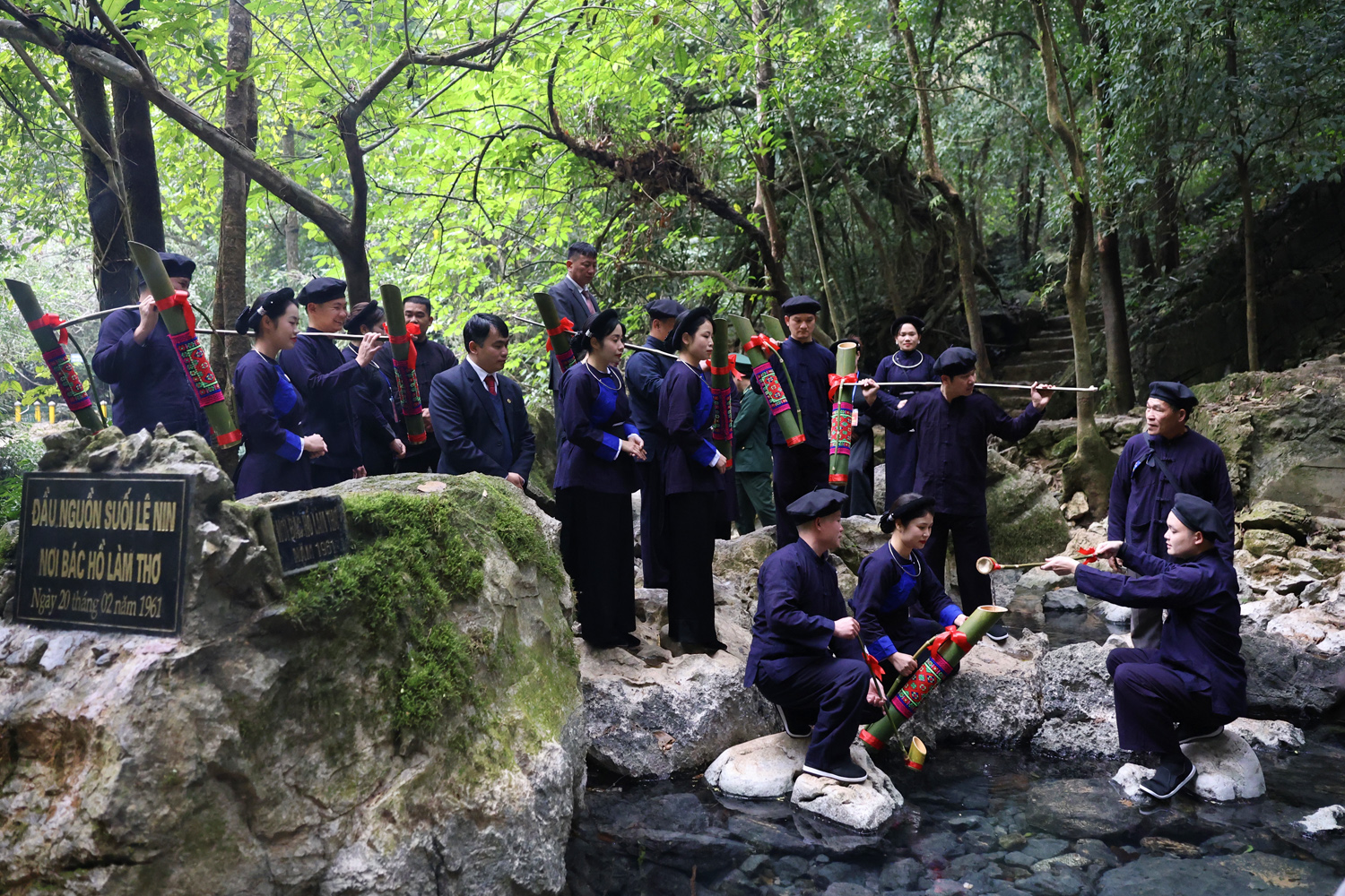 Nghi lễ lấy nước đầu nguồn tại suối Lê-nin ở Lễ hội về nguồn Pác Bó năm 2025_Nguồn: baocaobang.vn