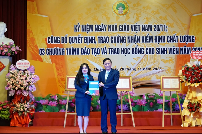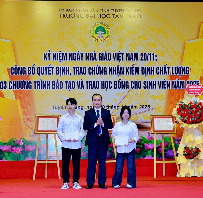 Bên cạnh sự đồng hành của các đơn vị, Nhà trường cũng vinh danh và trao học bổng cho Thủ khoa và Á khoa đầu vào năm 2025 – những tân sinh viên đạt thành tích cao nhất trong kỳ tuyển sinh, khởi đầu hành trình học tập mới đầy tự hào tại Trường Đại học Tân Trào.