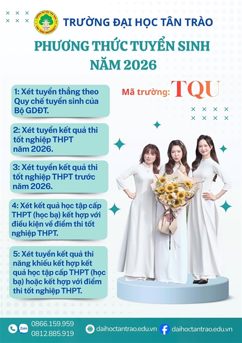Năm 2026, Trường Đại học Tân Trào (mã trường: TQU) áp dụng nhiều phương thức tuyển sinh linh hoạt, tạo thêm cơ hội cho thí sinh trên cả nước lựa chọn ngành học phù hợp và thực hiện ước mơ đại học.