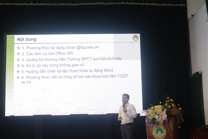 Hội nghị nhằm nâng cao chất lượng công tác chuyển đổi số và nghiên cứu khoa học, góp phần thúc đẩy đổi mới, sáng tạo, đáp ứng yêu cầu phát triển của nhà trường và xã hội trong thời kỳ chuyển đổi số quốc gia. Tại hội nghị, PGS.TS Lê Văn Hùng - Phó Trưởng phòng Quản lý khoa học và Hợp tác quốc tế đã chia sẻ các nội dung: Phương thức sử dụng email @tqu.edu.vn; Các dịch vụ của Office 365; Quảng bá thương hiệu Trường Đại học Tân Trào qua bài trình bày; Xử lý dữ liệu trong không gian số – Những kỹ năng cần thiết để thu thập, xử lý, và bảo mật dữ liệu trong môi trường học thuật hiện đại; Hướng dẫn chèn tài liệu tham khảo tự động từ Word – Cách sử dụng công cụ trích dẫn trong Microsoft Word giúp chuẩn hóa bài viết học thuật; Phương thức viết và công bố bài báo khoa học trên TCQT uy tín – Chia sẻ kinh nghiệm chọn tạp chí, định dạng bài viết và gửi bài đến các tạp chí quốc tế.