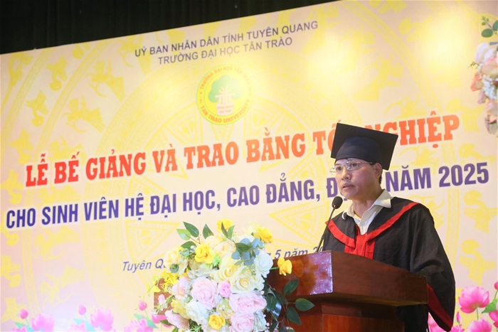 Phát biểu tại buổi lễ, TS. Nguyễn Minh Anh Tuấn – Bí thư Đảng uỷ, Hiệu trưởng đã gửi lời chúc mừng nồng nhiệt và biểu dương tinh thần nỗ lực, ý chí vươn lên không ngừng của các bạn sinh viên trong suốt chặng đường học tập và rèn luyện tại trường. Tiến sĩ cũng bày tỏ sự trân trọng trước sự tin tưởng mà các bạn sinh viên đã dành cho Nhà trường, lựa chọn Trường Đại học Tân Trào là đơn vị đào tạo, đồng hành cùng các bạn trên hành trình chinh phục tri thức. Trong những năm qua, Trường Đại học Tân Trào không ngừng khẳng định vị thế là cơ sở đào tạo uy tín, là nơi ươm mầm cho biết bao thế hệ sinh viên đến từ nhiều tỉnh thành trên cả nước. Nhà trường đã đạt chuẩn kiểm định chất lượng giáo dục – một minh chứng rõ nét cho cam kết không ngừng nâng cao chất lượng giảng dạy và học tập. Dự kiến trong thời gian tới, Nhà trường sẽ hoàn thiện các điều kiện để mở rộng đào tạo trình độ thạc sĩ, tạo điều kiện thuận lợi để các bạn sinh viên, học viên có thể tiếp tục theo đuổi con đường học vấn ở bậc cao hơn ngay tại ngôi trường thân quen này.