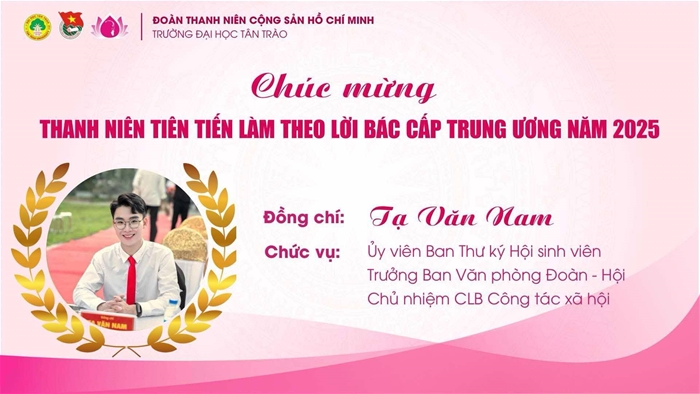 Đặc biệt, trong số đó, sinh viên Tạ Văn Nam – đại diện đến từ Trường Đại học Tân Trào – là gương mặt trẻ tiêu biểu trong lĩnh vực học tập và hoạt động Đoàn – Hội. Với thành tích học tập ấn tượng, tinh thần nhiệt huyết, trách nhiệm trong công tác Đoàn và phong trào sinh viên, Tạ Văn Nam không chỉ là niềm tự hào của Trường Đại học Tân Trào mà còn là hình mẫu truyền cảm hứng cho thế hệ trẻ Tuyên Quang.