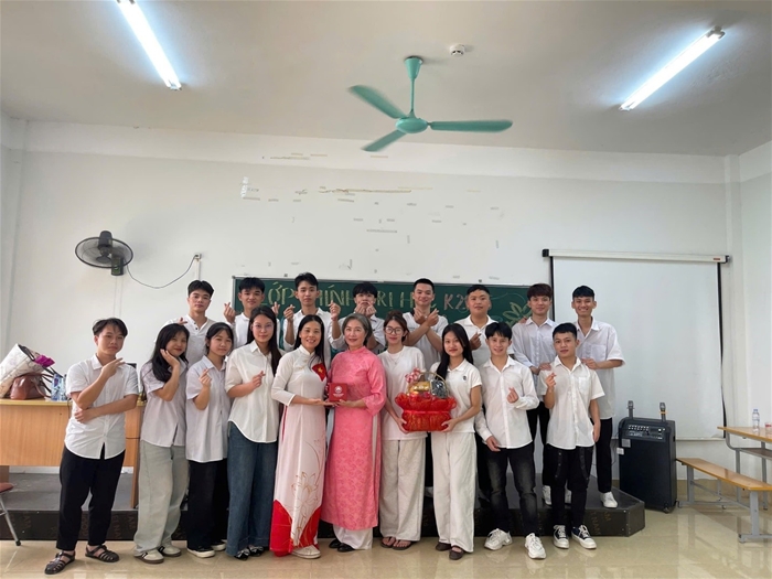 NSƯT Thanh Hương chụp ảnh lưu niệm cùng lớp Cô Mỹ Bình – Giảng viên dạy môn Mỹ học